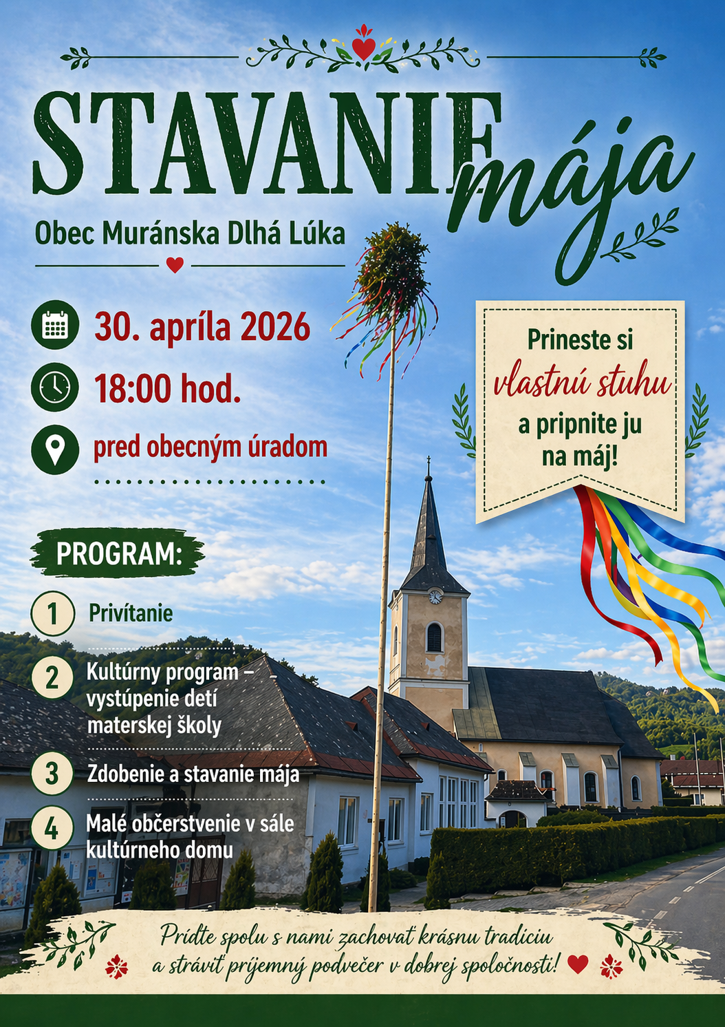 Obec Muránska Dlhá Lúka Vás srdečne pozýva na Stavanie mája 30.apríla 2026 o 18,00 hod.pred obecným úradom.